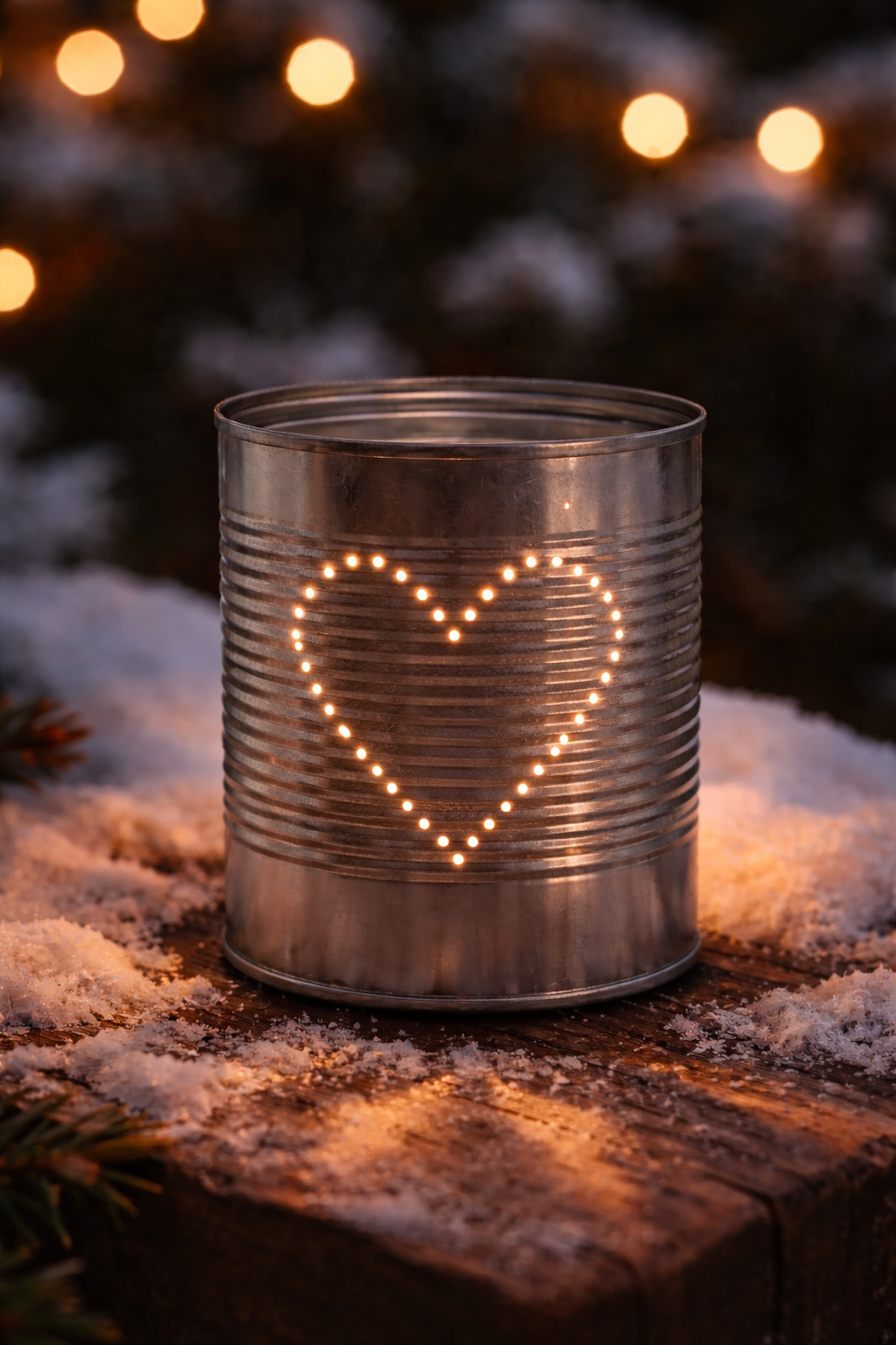 Instructions: After enjoying a can of Spaghettios, save the can. Clean it out and fill it with water, then freeze. Having a hard surface behind the tin can will make hammering a design in easier.