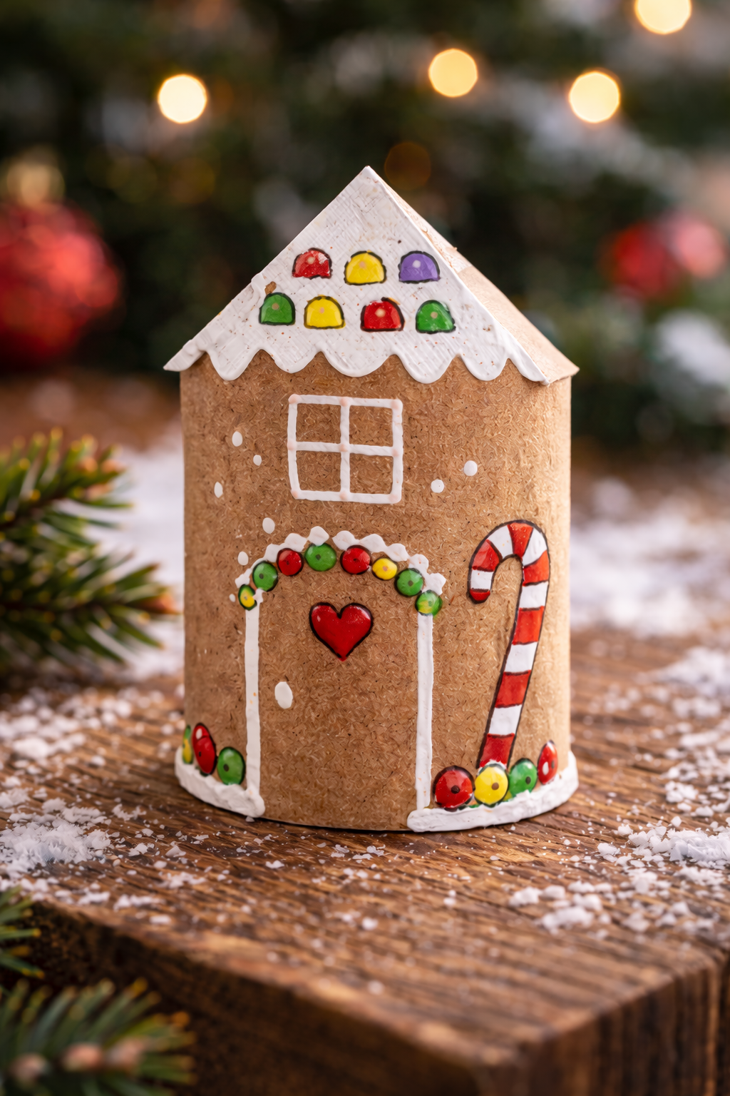 Instructions: Simple cut a triangle into a paper tube and you have the shape of a tiny little house. You can keep cutting the tube to make as many houses as you would like! Decorate each one with little windows, doors, treats and some snow, too. One fun idea is to try to make famous houses (from pop culture, history, etc.)